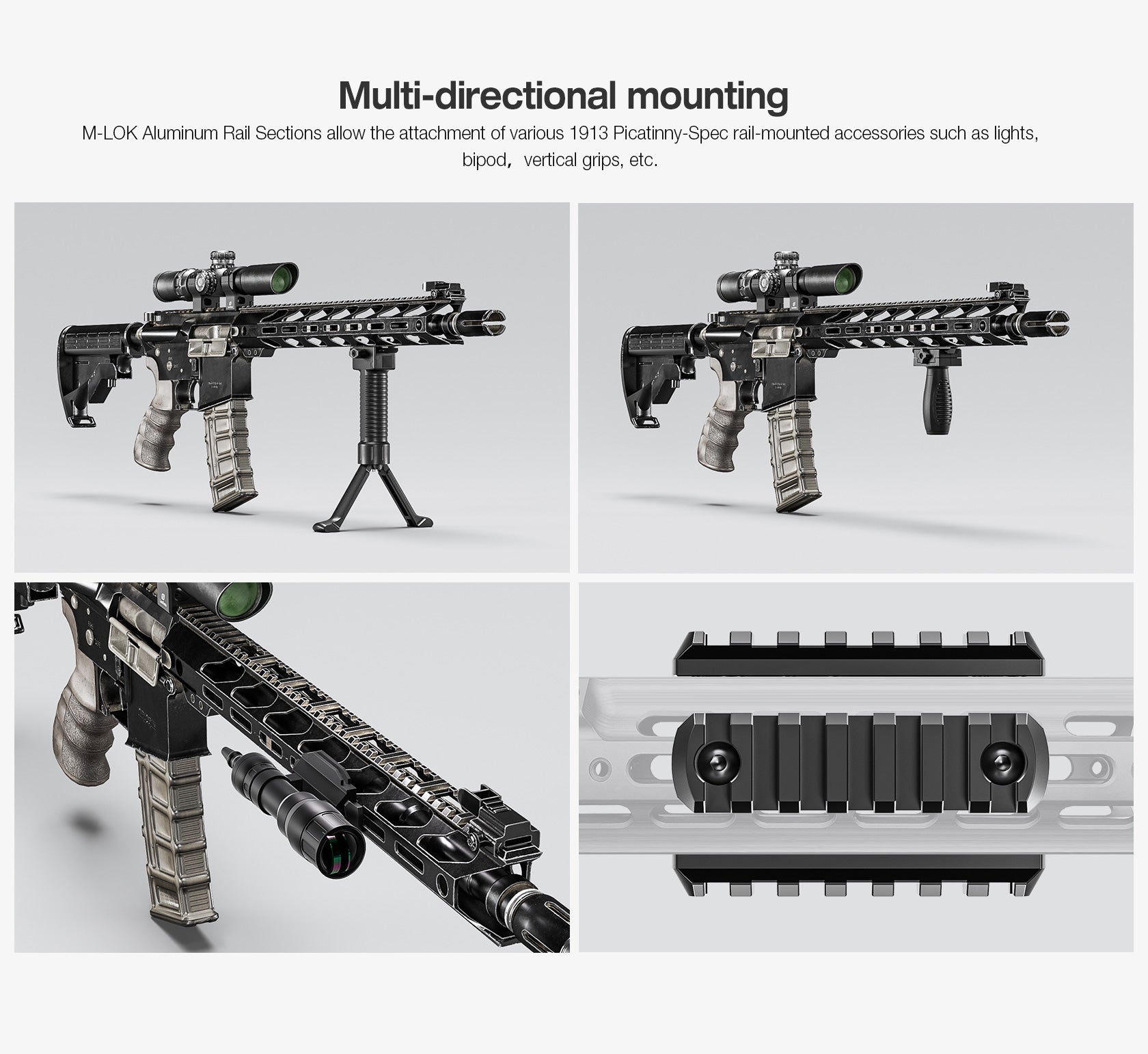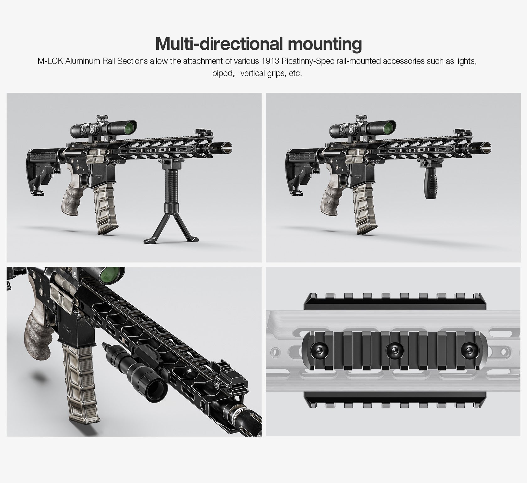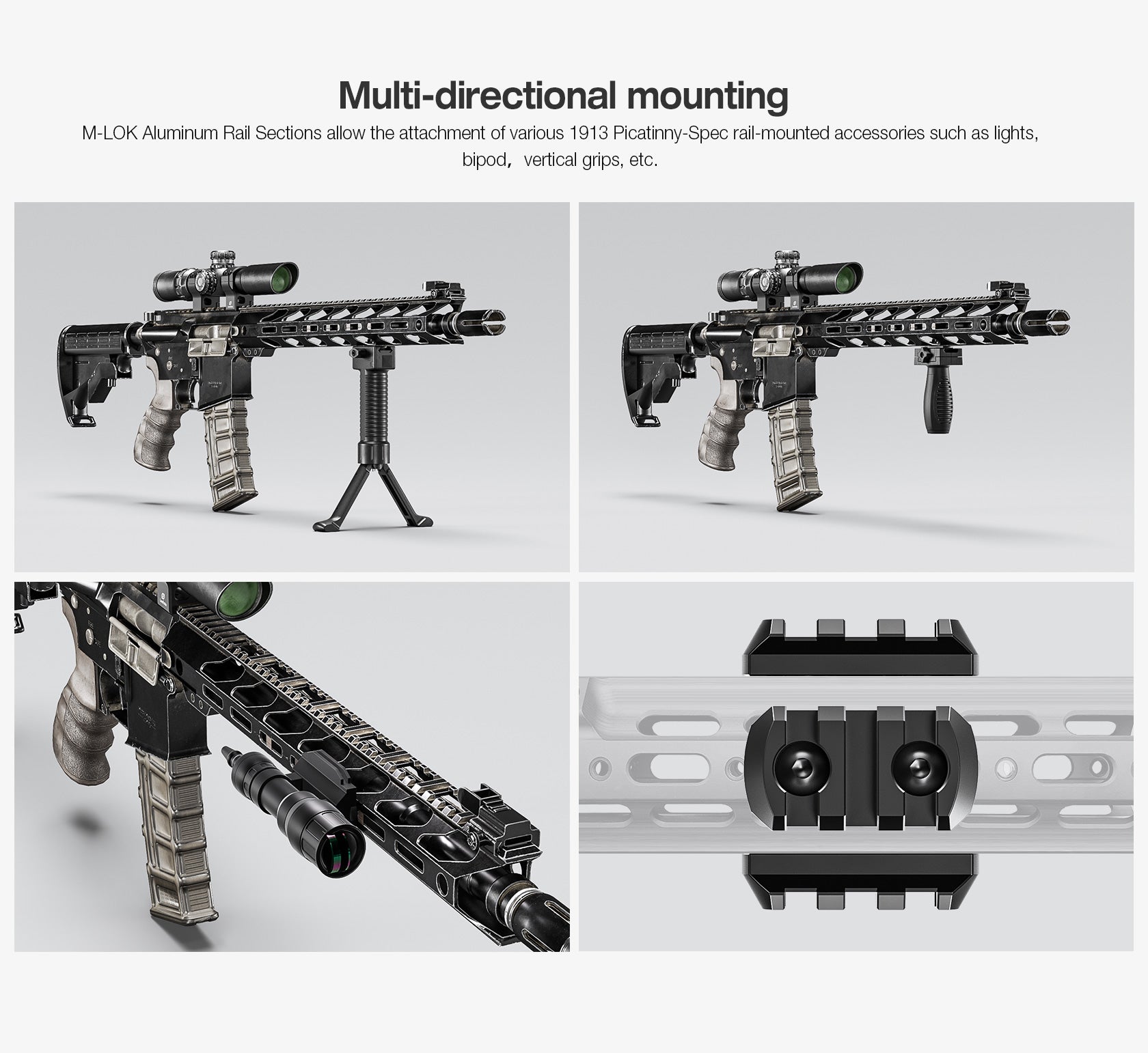 Die Montage erfolgt über das M-LOK System mit stabilen T-Nuts und mehreren Befestigungspunkten. Dadurch entsteht eine spielfreie Verbindung ohne Bewegung oder Spiel im System.